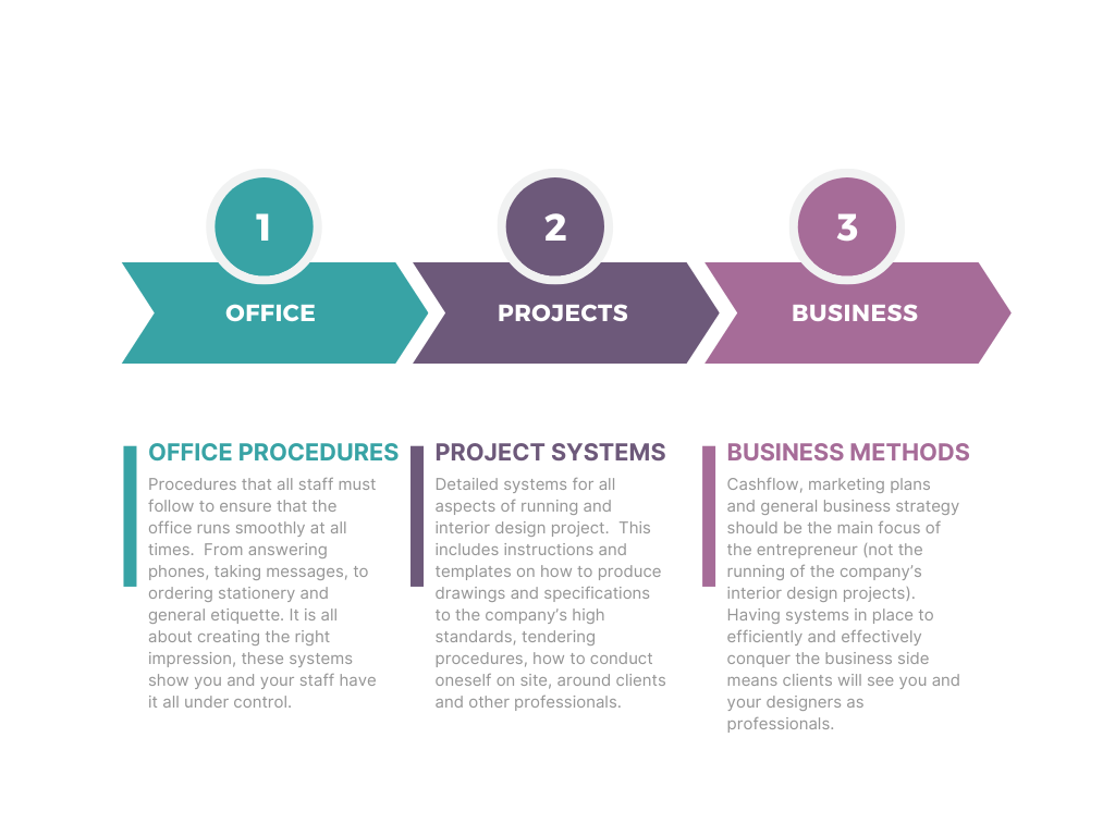I firmly believe that anyone who implements business systems will find themselves with more time on their hands to focus on the bigger picture of running the business and strategizing for future success. Thus, business systems can, not only improve the quality of designers’ lives, but ensure that a professional image is being presented to the public at all times. By implementing business systems our message will be clear: interior designers are professionals in what they do, they have it all under control.